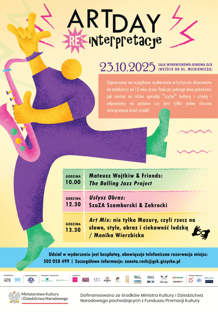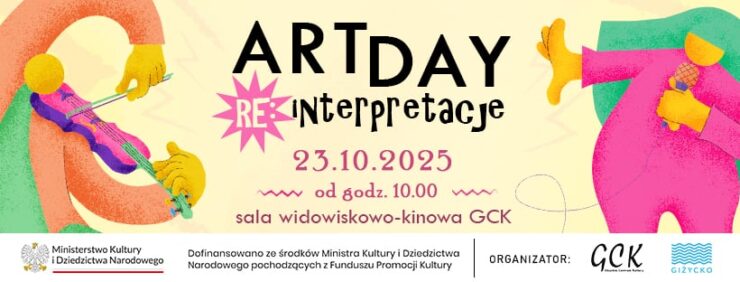 23 października 2025 roku sala widowiskowo-kinowa Giżyckiego Centrum Kultury stanie się przestrzenią spotkania z muzyką, obrazem, słowem i wyobraźnią. W ramach wydarzenia ART DAY: Re-interpretacje młodzi mieszkańcy Giżycka, czyli młodzież od 13. roku do 18 życia będą mieli okazję uczestniczyć w wyjątkowym projekcie, którego celem jest ukazanie sztuki w wielu odsłonach i pokazanie, że interpretacja dzieła nigdy nie jest jednoznaczna.
