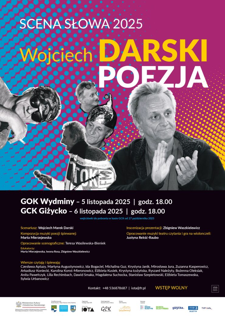 Giżyckie Centrum Kultury oraz Fundacja Teatr IOTA zaprasza 6 listopada na godzinę 18:00 na prezentację działań powarsztatowych „Scena Słowa 2025: Wojciech Darski Poezja”.
